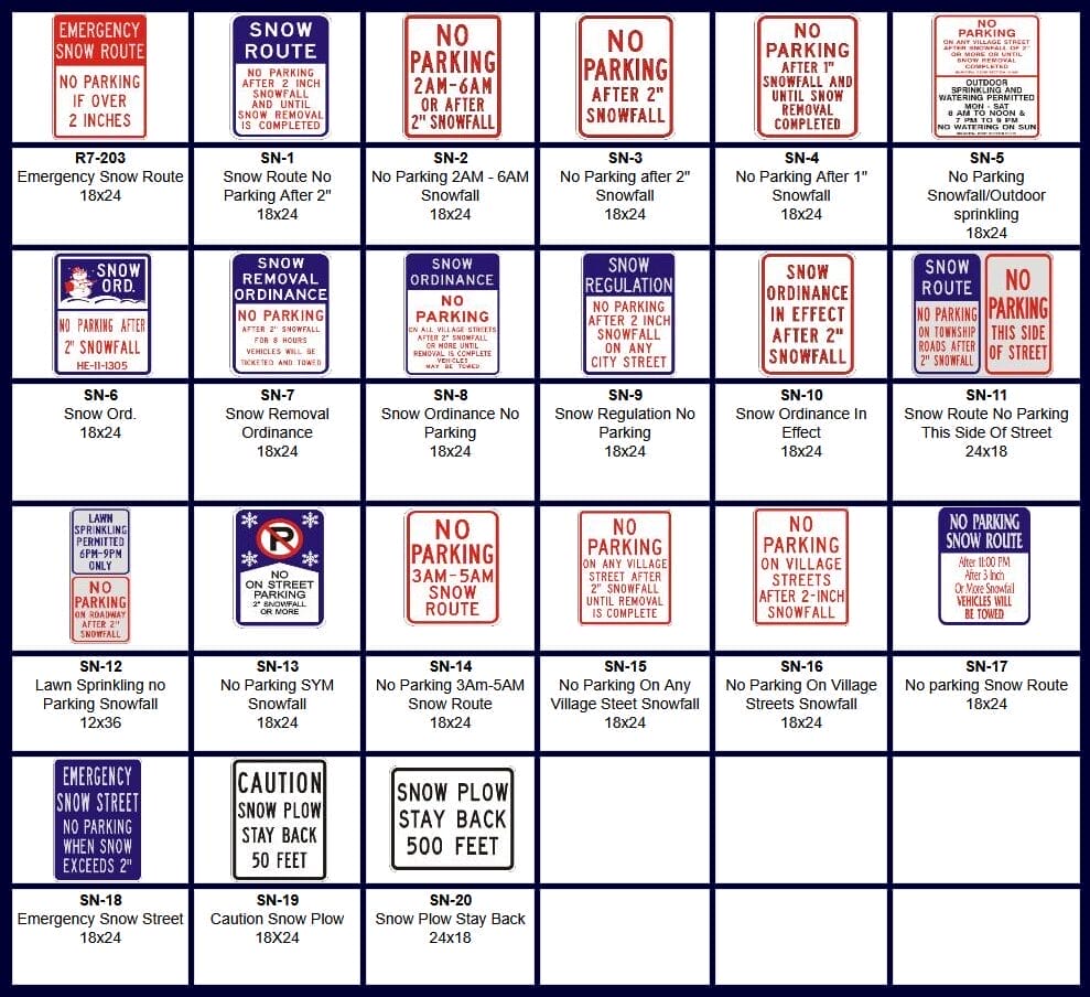 Snow route signs indicate that specific parking restrictions are in effect during a snow emergency to allow plows and other city vehicles to clear the streets. The signs prohibit or limit parking to ensure emergency access and safe snow removal.